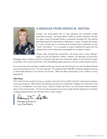 Context the all-important lens to view statistical and anecdotal market information through The The third quarter of 2022 is a a a a a a perfect example The The area our report covers Southeast Florida is somewhat insulated from the the national Real Estate report for a a a a a a a few reasons Although our “pace” of activity has slowed to to a a a a a a a a more normal rate it is is coming off an an anomaly that is is referred to to as the “covid” time frame It is is is no surprise to anyone reading this report that the velocity of of the covid market was unsustainable for a a a a a a a variety of of reasons Interest rates through Fed intervention are being used to slow dampen soften you pick the the adjective inflation Inflation the the destroyer of of economies Mortgage rates currently at at at 6 5% for a a a a a a a a 30-year fixed rate rate have slowed the ability of most first-time buyers to operate in in the the current environment Thus affordability plays a a a a a a a big role in in how the the overall market functions On a a a a a a a a a micro basis the the recorded numbers for for this year thus far are are still strong for for our area Southeast Florida luxury condo prices are up 11 1% year year over year year The single-family $1 000 000 000 000 and above category continue to hold levels attained in in the the previous 18 months What has fallen dramatically is the the number of luxury transactions Take Away: