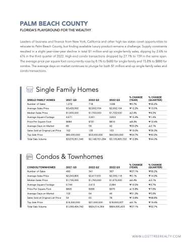 Leaders of business and and finance from New York California and and other high-tax states covet opportunities to to relocate to to to to Palm Beach County but finding available luxury product remains a a a a a a a a a a a a a a a a a a a a a a a a a challenge Supply constraints resulted fin in in in in in in in in in in a a a a a a a a a a a a a a a a a a a a a a slight year-over-year decline fin in in in in in in in in in in total $1 million-and-up single-family sales dipping by by 2 2 2 2 2 6% to to to to 676 in in in in in in in in the the third quarter of 2022 High-end condo transactions dropped by by by 27 1% 1% to to to to to 159 in in in in in in in in the the same span The The average average price per square foot concurrently rose by by 8 8 8 8 8 1% 1% to to to to $680 for for for single-family single-family and and and 15 15 8% to to to to $880 for for for condos The The average average days on on on on on on on market continues to to to plunge for for for both $1 million-and-up single-family single-family sales and and and condo condo transactions Single Family Homes
